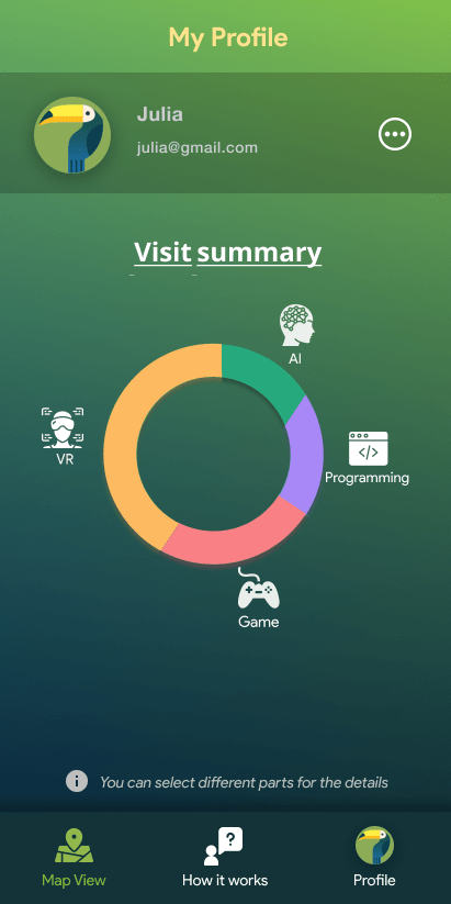 By registering how much time the visitors spend on different activities, he visitors can then learn more about what they appear to find most interesting, and see what they might have missed. By bringing a quantified version of the science center home when the visit is over, they can keep exploring the topics from the science center whenever they like.